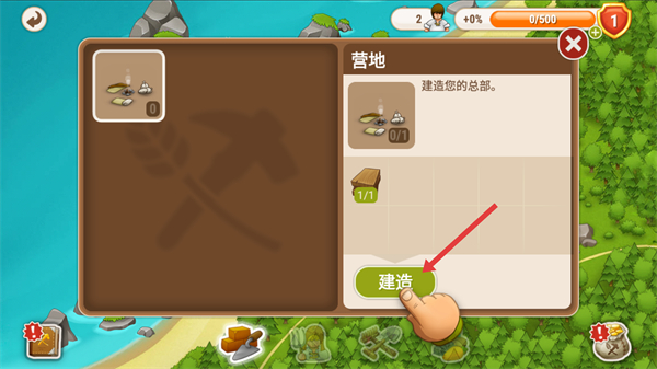 1、可建造營地,點擊建造按鈕即可開始建造總部,正式開啟荒島的建造經營之旅。