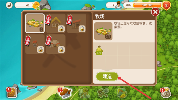 4、還能建造牧場,在牧場上可收割糧食、收集蛋,點擊建造按鈕開始建造,豐富荒島的生產經營內容。