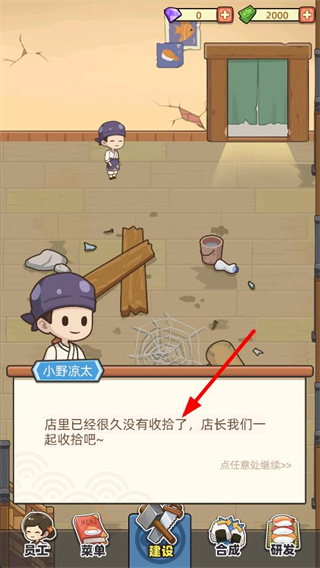 1、查看角色對話,了解店鋪需要收拾的任務,點擊任意處繼續流程,開啟壽司店的翻新經營之旅。