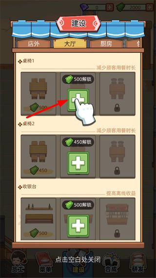 3、進入建設界面的大廳分類,消耗貨幣解鎖桌椅等設施,完善店鋪的大廳布局,提升接待顧客的基礎條件。