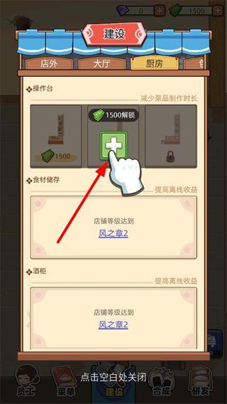 4、切換到建設界面的廚房分類,當滿足條件后消耗貨幣解鎖操作臺等廚房設施,優化菜品制作的硬件條件,推進店鋪經營。