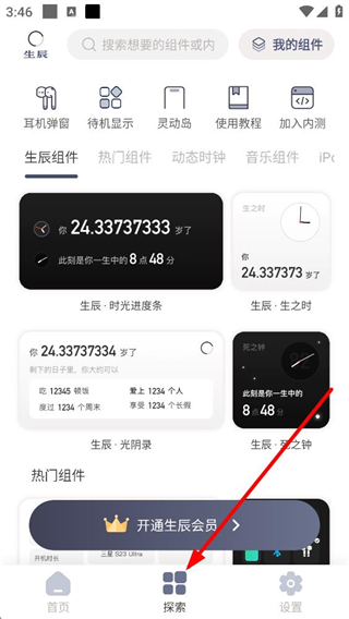 2、探索界面滿是驚喜,搜索框可探尋心儀組件,生辰熱門等分類里時光進度條算年齡生之時死之鐘刻瞬間,多樣設計將抽象時間具象化,流淌著對生命的細膩解讀。