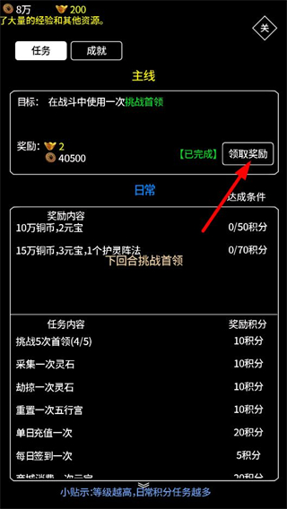 4、完成主線任務后領取獎勵,獲取元寶和銅幣等資源,加速角色的修仙發展,推進游戲劇情和副本挑戰。