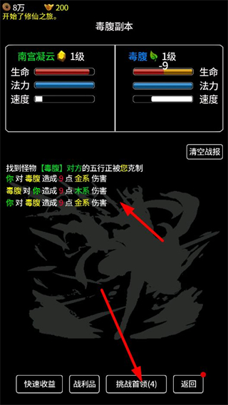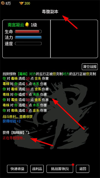 1、進入毒腹副本,尋找怪物如毒蛛、毒腹等,利用五行克制對其造成傷害,獲取經驗和道具,推進修仙進程。
