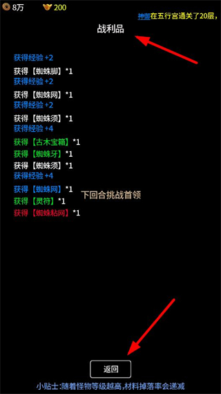 3、查看戰利品,獲取蜘蛛腳、古木寶箱等道具,積累修仙資源,提升角色的發展能力和副本挑戰優勢。
