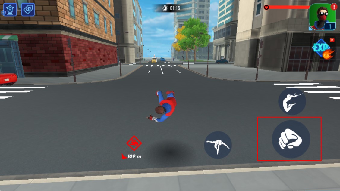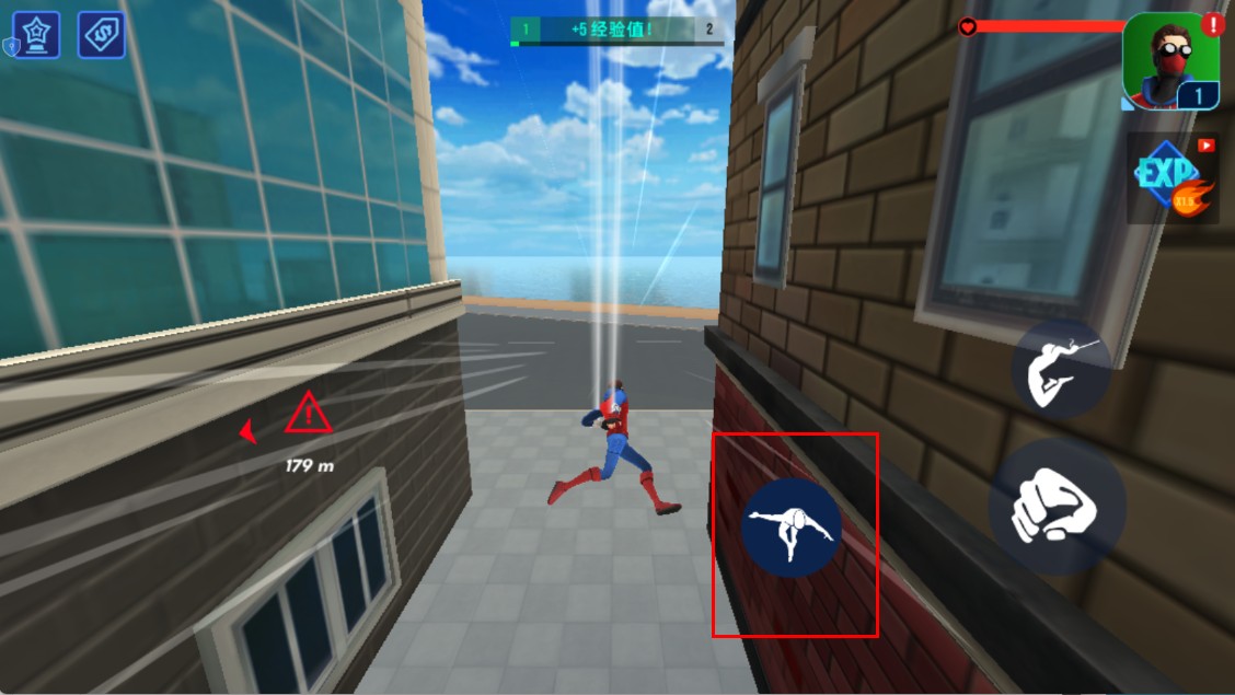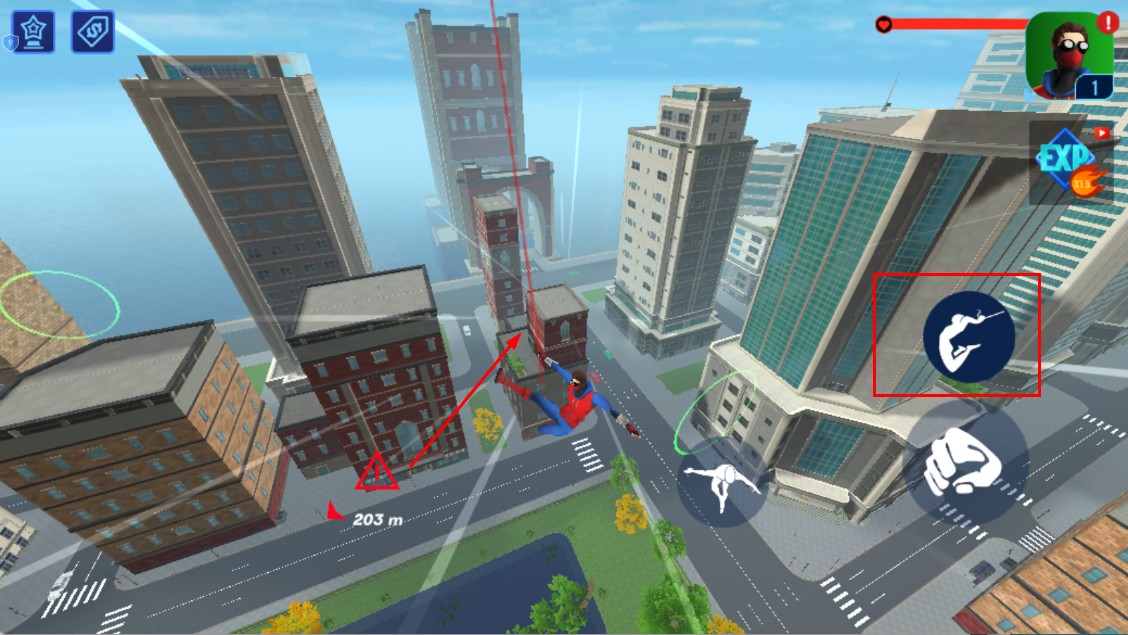 1、在高樓間,點擊右側蛛絲相關按鈕,蜘蛛俠會射出蛛絲,借助蛛絲在建筑間蕩行,快速穿梭于都市上空。