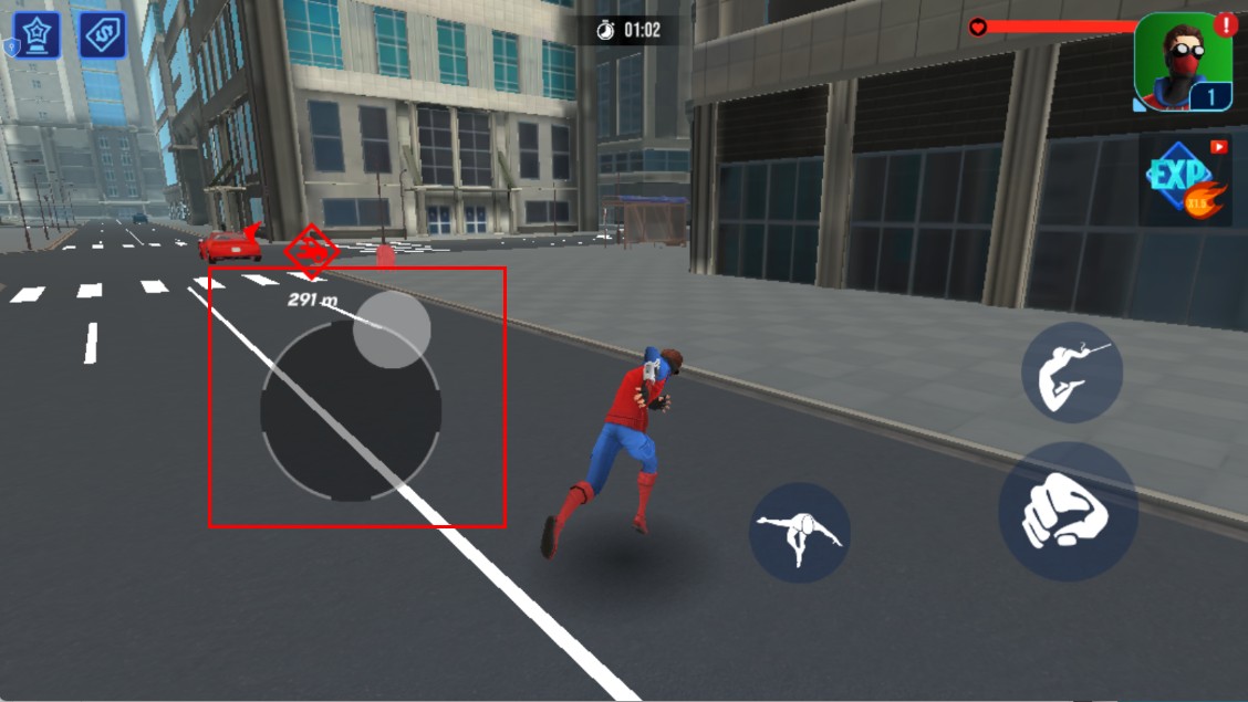 4、在街道等區域移動時,操控左側虛擬搖桿,可調整蜘蛛俠的移動方向,前往目標地點。