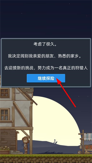 2、看到劇情提示后,點擊繼續探險按鈕,離開家鄉開啟新挑戰,推進游戲的劇情與冒險進程。