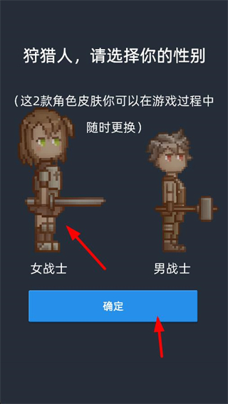 1、選擇女戰士或男戰士的性別,選好后點擊確定按鈕,確定初始角色形象,開啟獵人的冒險流程。