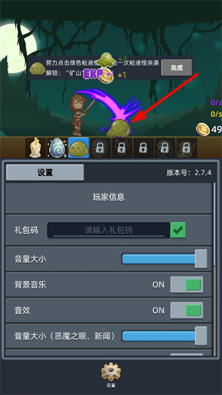 4、攻擊綠色粘液怪,完成擊殺后解鎖新內容,同時可在設置界面調整音量等參數,優化游戲體驗。