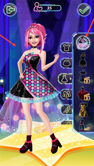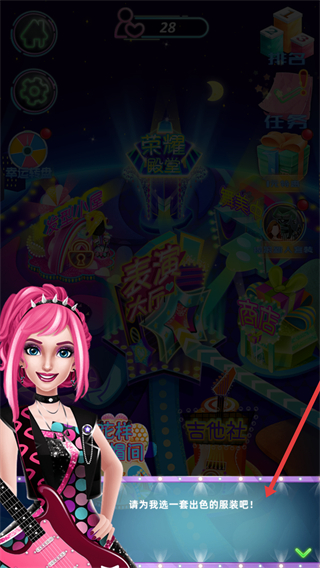 1、會提示為角色選一套出色的服裝,界面有榮耀殿堂、表演大廳等多個功能板塊,開啟時尚搖滾裝扮之旅。