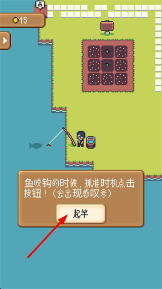 4、釣魚時等魚咬鉤出現感嘆號,抓準時機點擊起竿按鈕完成釣魚,獲取魚類資源,豐富田園經營的資源類型。