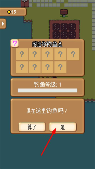 3、進入釣魚界面,查看附近釣魚點,選擇是按鈕開啟釣魚操作,釣魚等級初始為1,可通過釣魚提升等級。