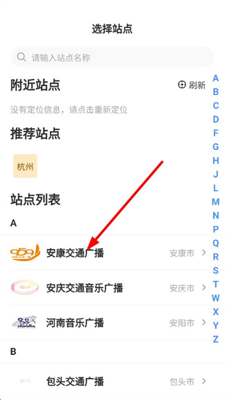 1、站點選擇頁設搜索欄分附近、推薦、列表,推薦站點含杭州,站點列表按字母排列廣播電臺,方便用戶選想聽的廣播站點。