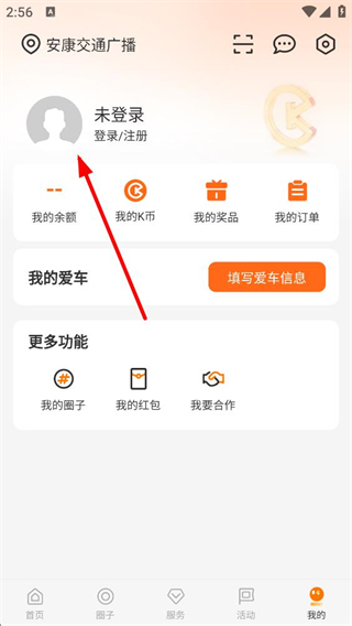 2、進入站點界面后,可看到未登錄狀態及登錄注冊入口,同時能使用我的余額我的K幣等功能,還可填寫愛車信息及使用更多功能選項。