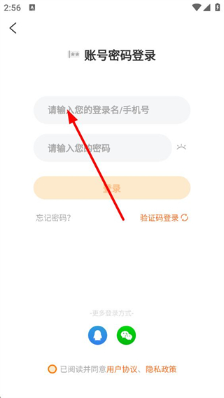 4、選擇賬號密碼登錄后,需在對應輸入框填寫登錄名手機號及密碼,完成后點擊登錄按鈕,也可選擇忘記密碼或切換驗證碼登錄方式。