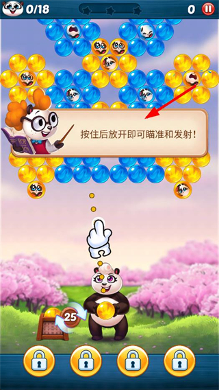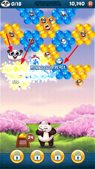 1、按住屏幕瞄準泡泡區域,松開后發射泡泡,匹配相同樣式的泡泡來消除,開啟拯救熊貓寶寶的關卡流程。