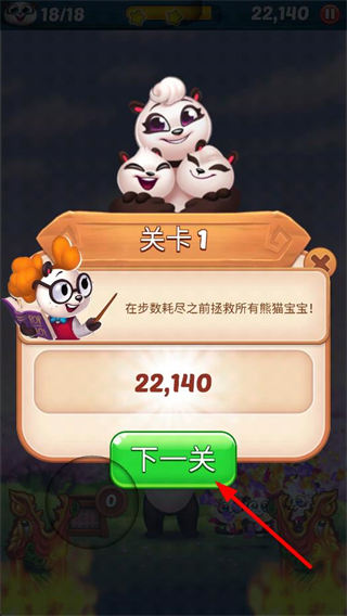 3、完成關卡的熊貓寶寶解救任務后,查看通關積分,點擊下一關按鈕,準備進入新的泡泡拯救關卡。