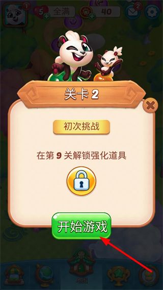4、進入新關卡界面,查看關卡提示,點擊開始游戲按鈕,開啟新一輪的泡泡消除與熊貓拯救挑戰。