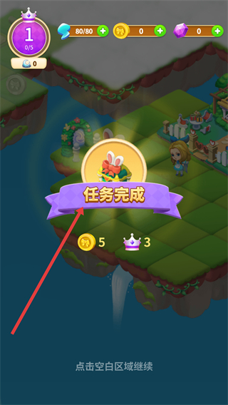 4、完成任務后會出現任務完成界面,玩家可獲得金幣和皇冠獎勵,點擊空白區域繼續探索莊園。