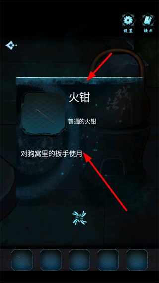 3、可獲取火鉗等道具,對狗窩里的扳手使用道具,發揮道具作用,解開相應謎題。