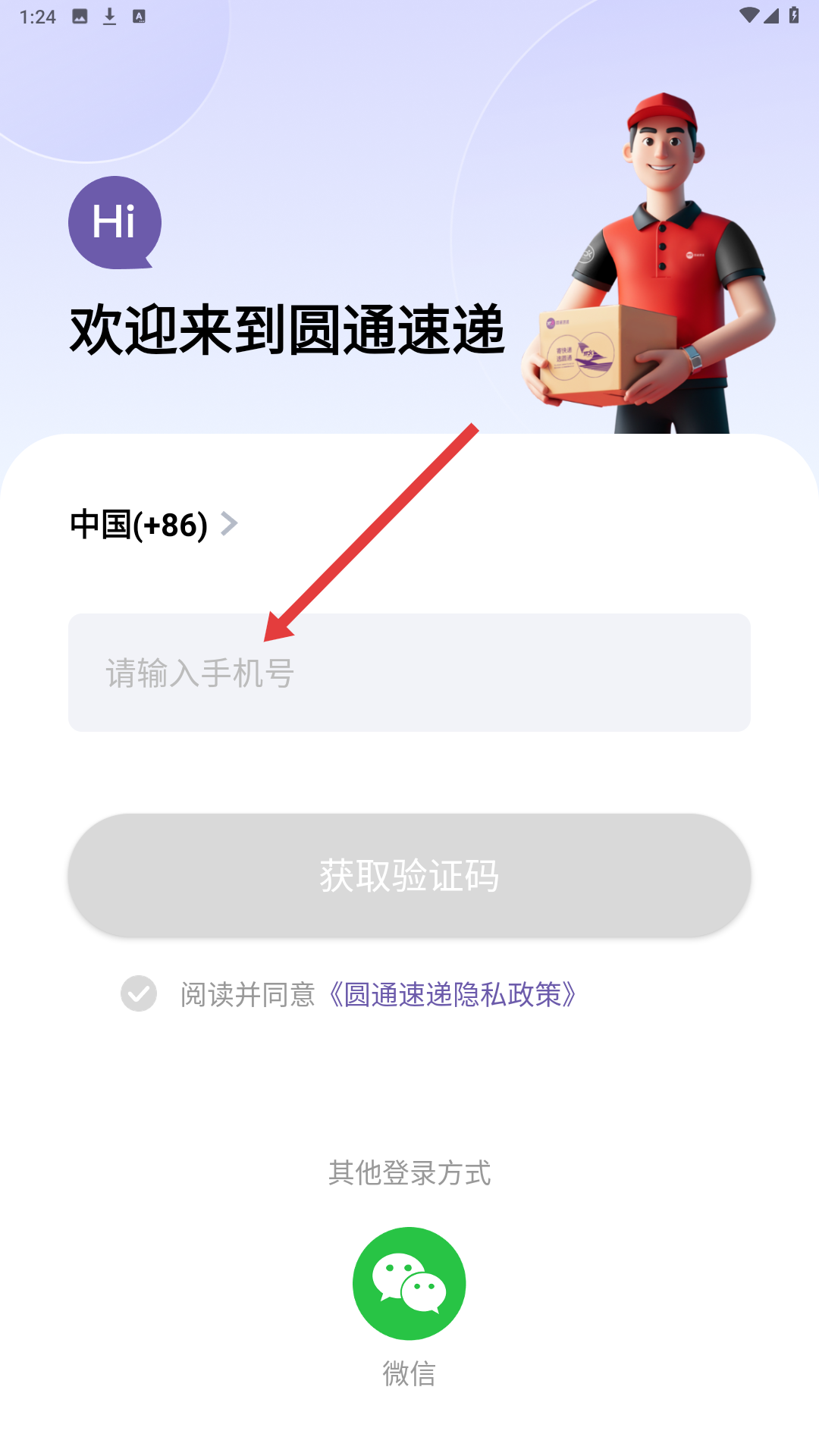 2、登錄界面,輸入手機號并獲取驗證碼,閱讀并同意隱私政策后即可完成登錄。