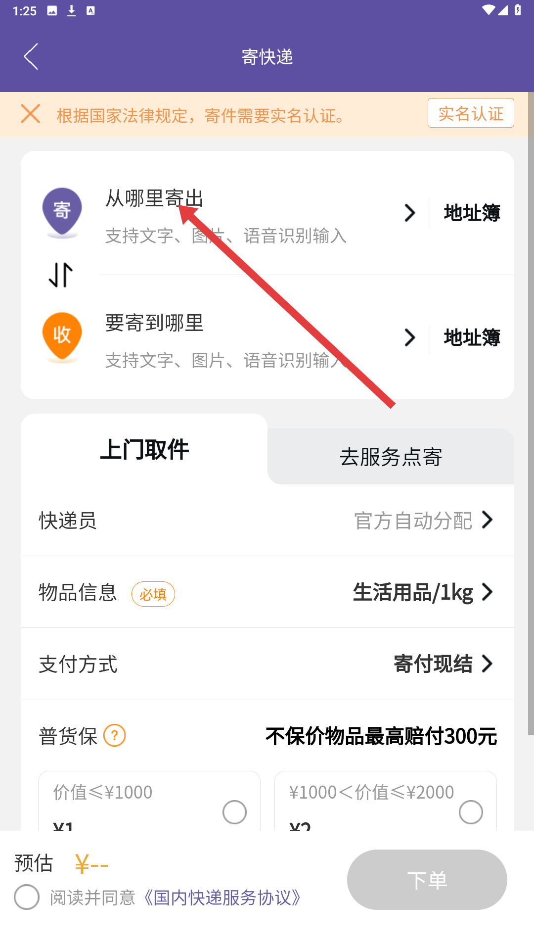 4、寄快遞頁面,需填寫從哪里寄出和要寄到哪里的地址信息,還可選擇上門取件或去服務點寄,完善物品信息、支付方式等內容后即可下單。