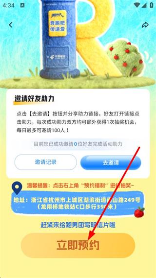 2、進入活動頁面后,可查看邀請好友助力的規則與活動地址,點擊立即預約按鈕,參與此次活動。