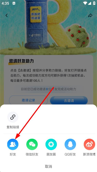 3、點擊活動頁面的去邀請按鈕,彈出分享窗口,可選擇好友、微信好友等渠道,分享助力鏈接。
