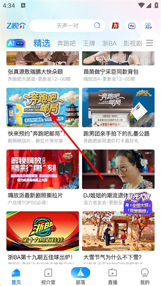 1、Z視介首頁瀏覽精選板塊內容,點擊奔跑吧郵局活動入口,進入該活動的專屬頁面,準備參與活動。