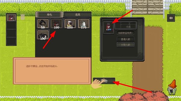 2、選擇角色卡片并點擊召喚,部署戰斗單位,構建防御陣容,通過選擇不同角色提升防御能力,應對即將出現的敵人。