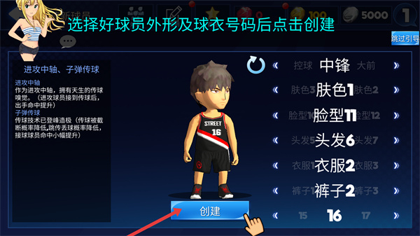 2、創建球員時,可選擇中鋒等位置,還能調整膚色、臉型、頭發、衣服、褲子及球衣號碼,選好后點擊創建即可擁有個性化球員。