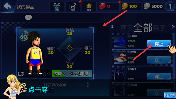 3、在我的物品界面,能查看球員彈跳、速度、投籃、防守等屬性,還可給球員穿上鞋子、衣服等裝備,提升球員形象與實力。