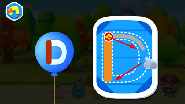 2、切換字母目標后,繼續參照右側新的路線提示,操控道具沿當前字母的軌跡移動,完成該字母的軌跡繪制,適配場景內的字母樣式。