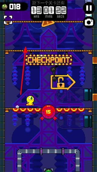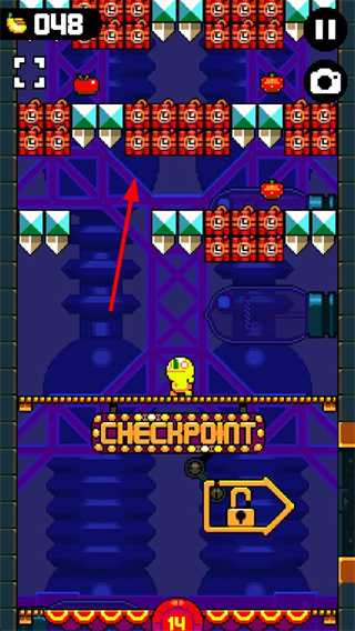 1、收集水果,解鎖存檔點:在跳躍過程中會收集到許多水果,這些水果可以用來解鎖存檔點,每跳躍到一定高度,就能碰到一個存檔點,但需要20個水果才能使用。