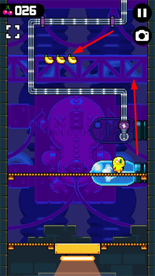 3、操控角色利用場景的管道等設施移動,獲取管道上的水果道具,同時觸發機關類裝置,推進關卡流程。