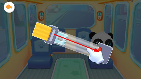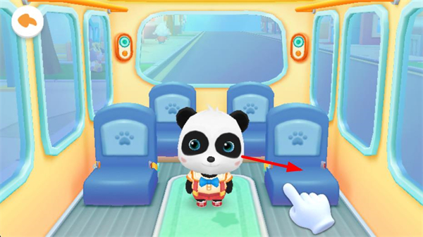 2、在巴士內部場景,點擊座位引導萌寵熊貓就座,安排乘客到指定位置,完成乘車準備,為后續的行程推進做好基礎布置。