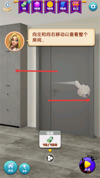 1、通過向左和向右移動來查看整個房間,界面還會顯示地板材料的收集進度,讓玩家清楚改造進展。