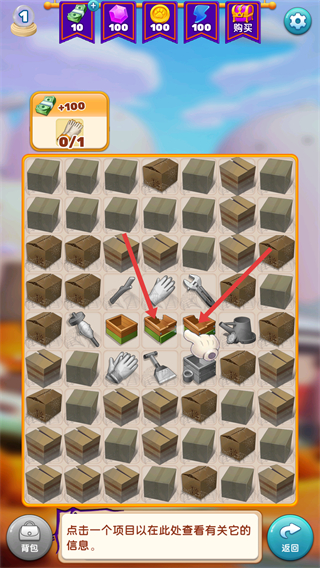2、進入消除小游戲:當金錢不足時,點擊右下角進入消除,通過拖動合并相同工具獲得金錢。