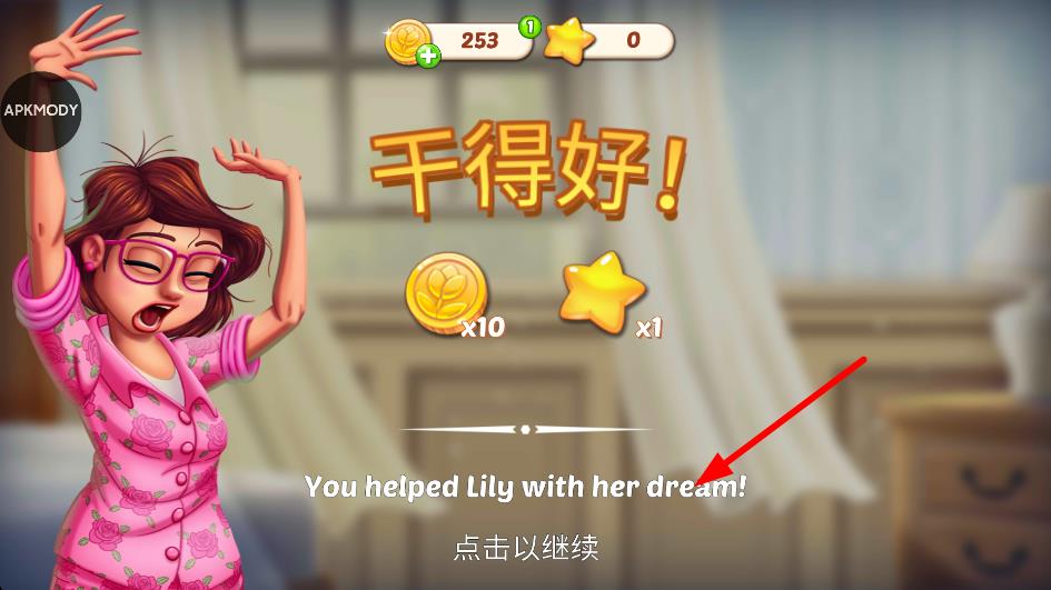 4、完成夢境挑戰后顯示干得好界面,提示幫助Lily完成了夢境,點擊以繼續按鈕回到主場景推進游戲。