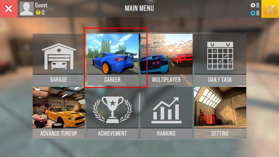1、進入游戲主菜單,點擊CAREER選項,可進入生涯模式,開啟賽車生涯挑戰之旅,體驗不同賽道的競速樂趣。