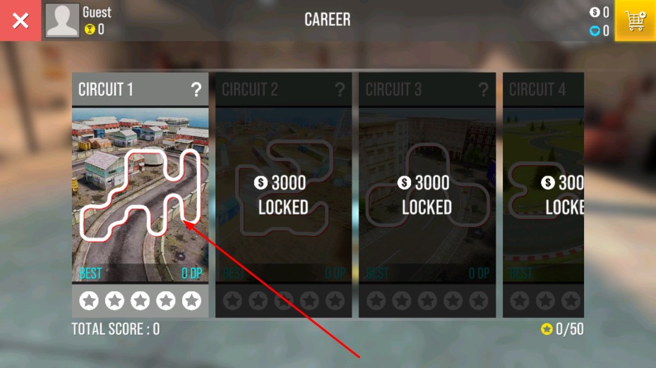 2、在生涯模式界面,選擇解鎖的賽道,比如CIRCUIT1,進入該賽道的競速挑戰,向著好成績發起沖擊。