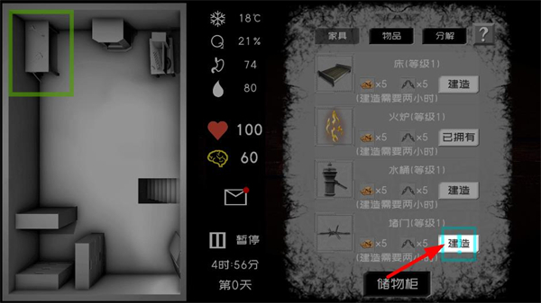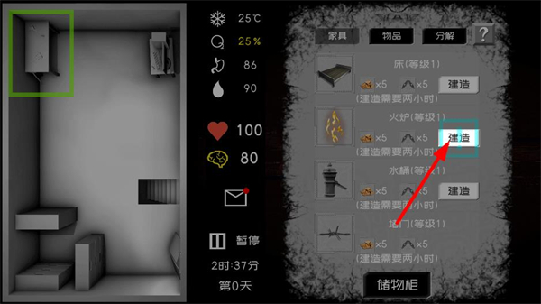 3、建造火爐等家具,火爐建造需要兩小時,建造后可用于取暖或烹飪,提升生存能力。