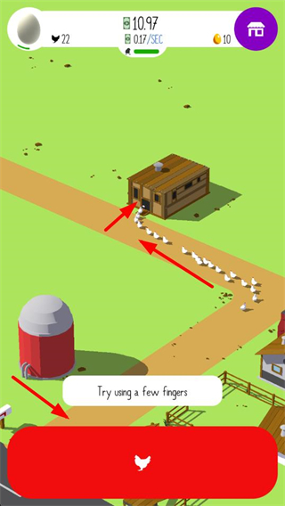 2、操作后小雞數量增加,沿路徑向建筑移動,界面數值變化,繼續按提示操作,讓更多小雞移動,推進農場的初步運營進程。