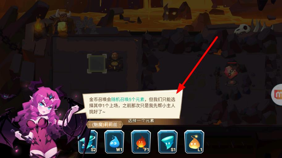1、金幣召喚會隨機召喚5個元素,需從中選擇1個上場,莉莉絲會介紹規則,幫助選擇元素參與防御。
