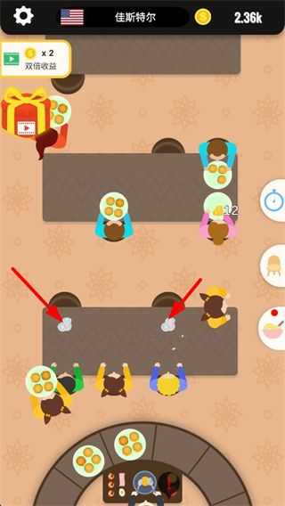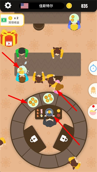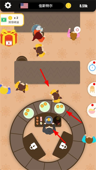 1、顧客會圍繞餐臺等待取餐,餐臺上會擺放備好的菜品,顧客取走菜品后會推進游戲進程,積累對應的資源。