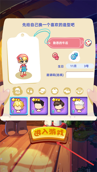 1、可給自己更換造型,選擇喜歡的發型等,設置生日、邀請碼后點擊進入游戲開始游玩。