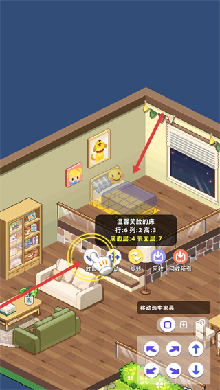 2、可在房間內移動家具,如溫馨笑臉的床,通過移動、旋轉等操作布置房間,打造舒適家居環境。