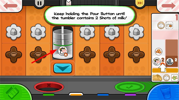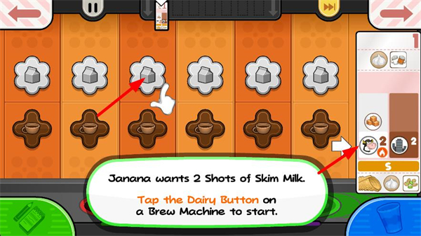 1、Janana想要2份脫脂牛奶,找到沖泡機上的乳制品按鈕,點擊該按鈕,即可開始準備對應食材,推進訂單制作流程。