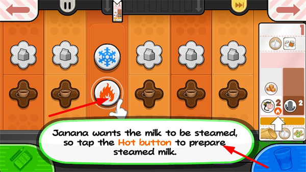 2、提示Janana想要牛奶被加熱,找到熱按鈕并點擊,通過這一操作來準備熱牛奶,滿足訂單里的熱飲要求。